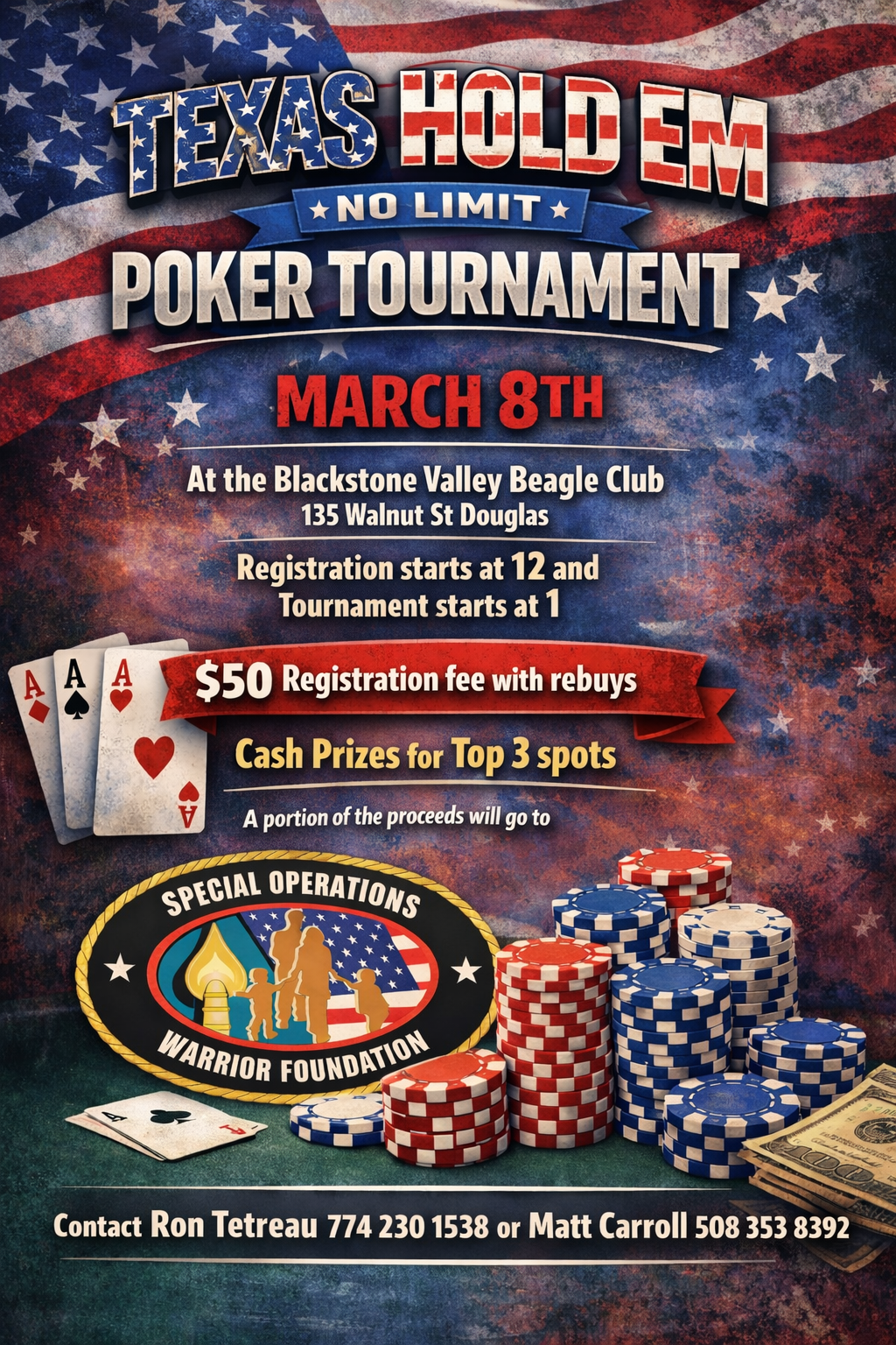 Texas Hold Em Poker Tournament A poker tournament in Massachusetts with a portion of the ... 08 Mar All Day Blackstone Valley Beagle Club135 Walnut St Douglas, MA