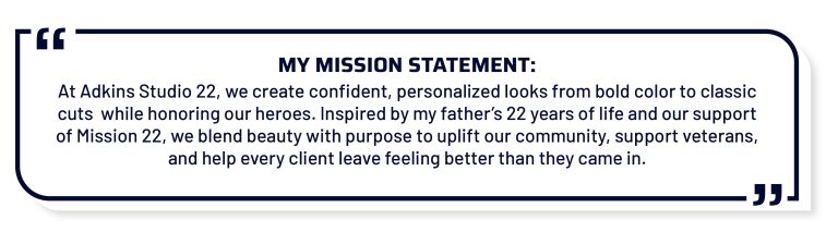 My name is Atlanta Adkins, I am an entrepreneur, SOWF graduate, and daughter of the late SGT. Dustin M. Adkins. I am the owner of Adkins Studio 22, a salon built on the mission of “Where beauty meets purpose.” The name for my salon, Adkins Studio 22, derives from my father’s name and his 22 years of life that continues to shape mine daily. I chose this profession because I love helping others feel confident and like the best version of themselves. Being able to watch someone’s face and eyes light up when they see their new look reminds me how powerful confidence in yourself truly is.